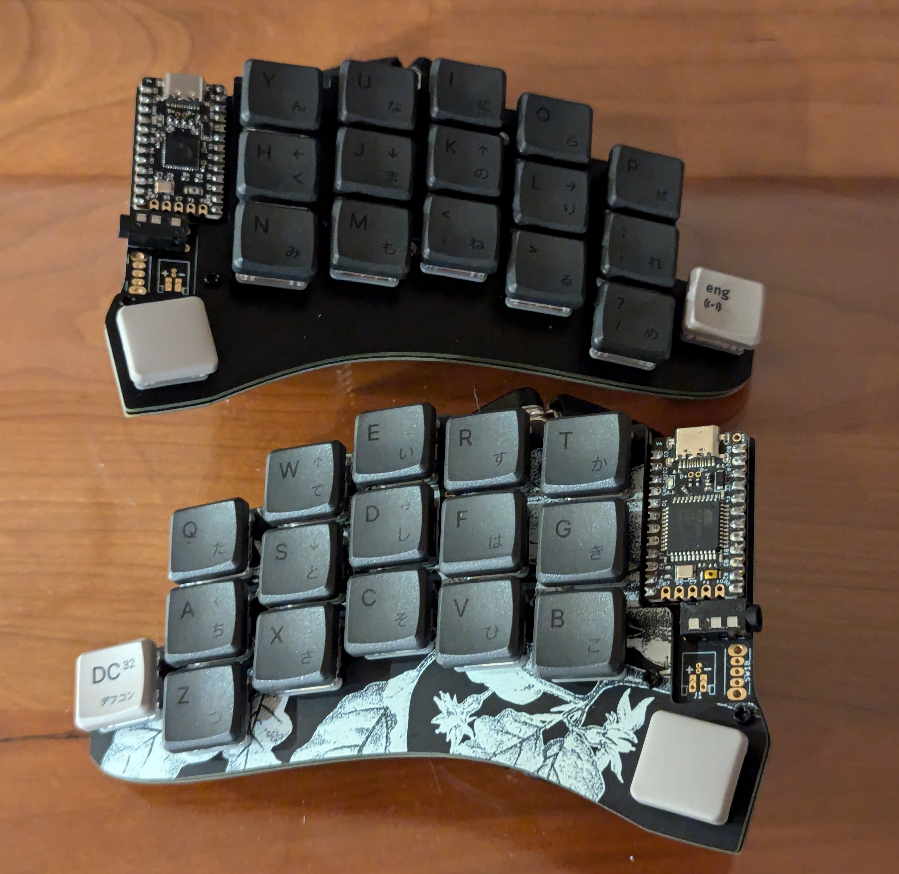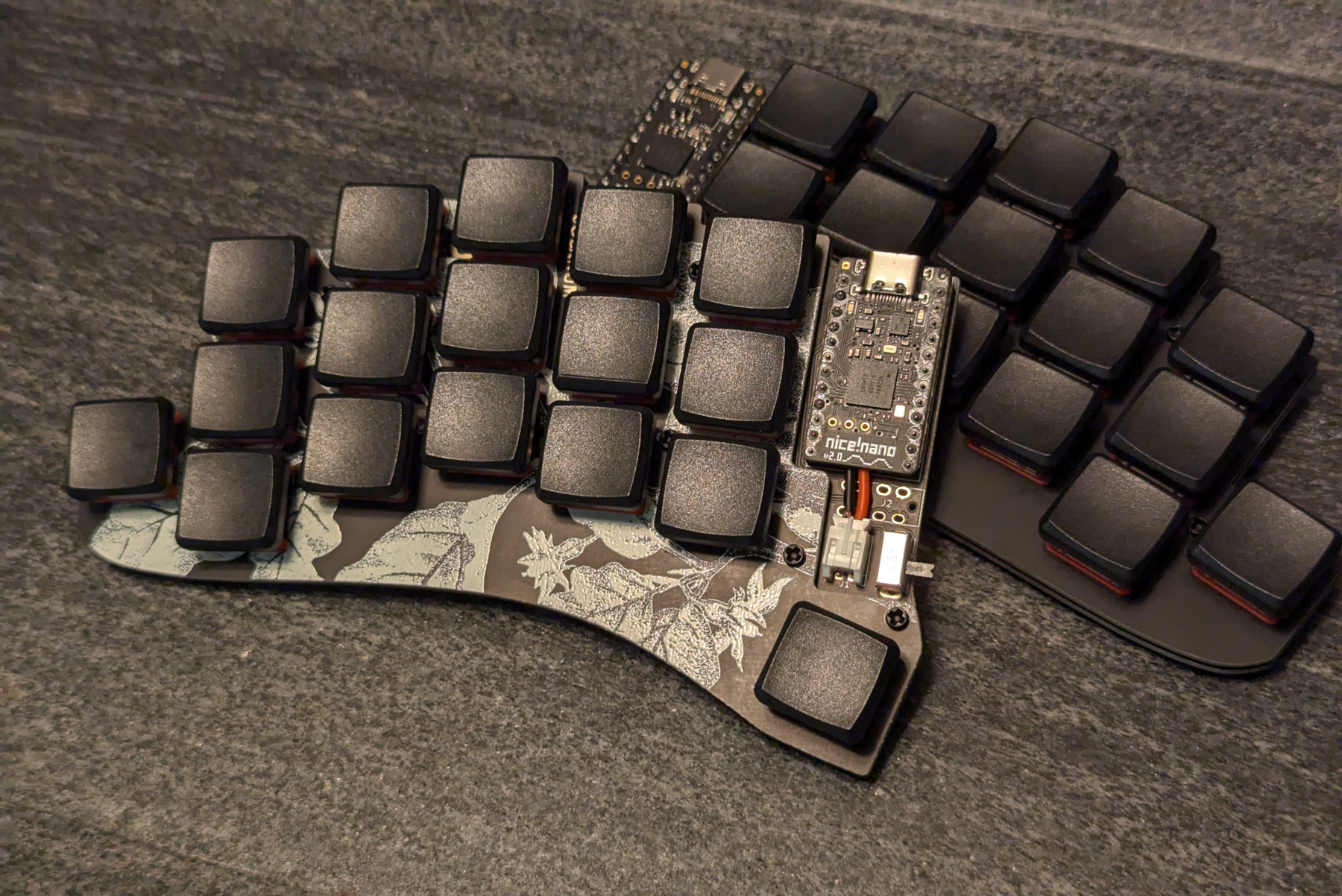 A 34-key split featuring splayed columns, a single thumb, and a extra pinky key.